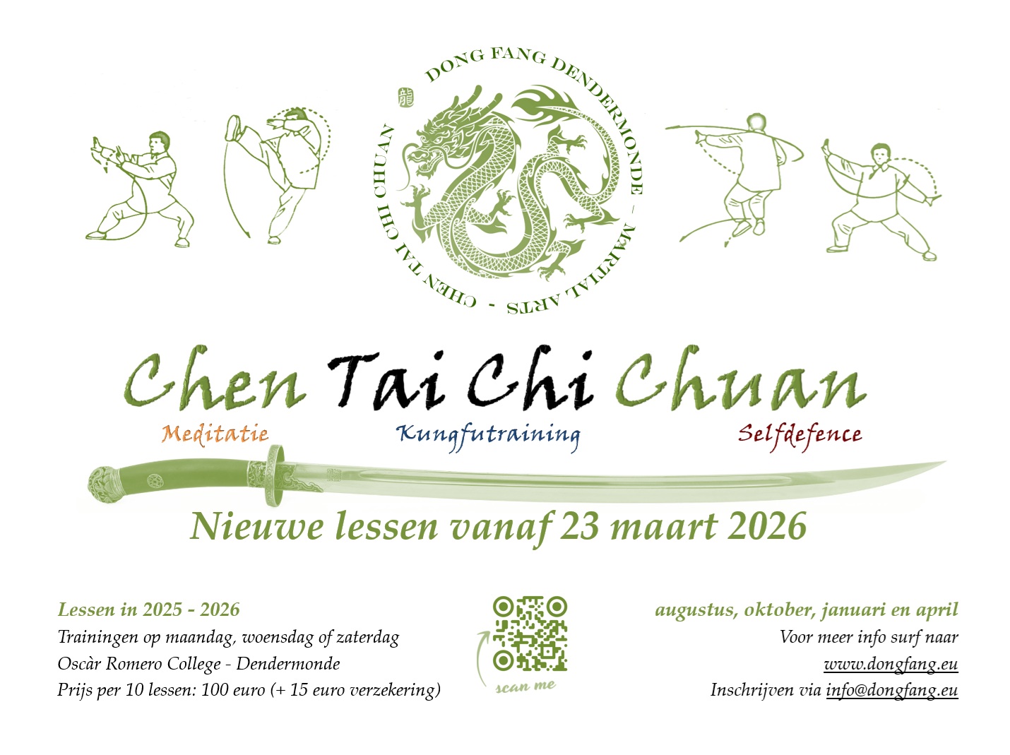Vanaf maandag 23 woensdag 24 en zaterdag 26 maart 2026 starten we met nieuwe lessenreeks voor beginners in de Chen stijl. Je kan als ‘absolute beginner’ lessen volgen op maandag-, woensdagavond of zaterdagochtend, of combineren. Voor maandagavond (de milde training) zijn de plaatsen beperkt tot 7 deelnemers. Deze groep is open voor alle leeftijden. Woensdag en zaterdag zijn er nog voldoende plaatsen. Deze trainingen staan op woensdag open voor jonger en enthousiast volk.